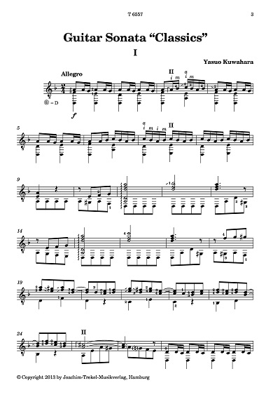 Die Gitarrensonate des großen japanischen Komponisten und Mandolinisten Yasuo Kuwahara ist eine Entdeckung. Kuwahara, dessen stilistische Bandbreite von elektronischer über atonale bis hin zu tonal-romantischer und folkloristischer Musik reichte, zeigt sich in diesem Werk „klassischen“ Vorbildern verpflichtet. In Anlehnung an japanische Volksmusik, wie er sie beispielsweise in „Jongara“ oder den „3 Fantasien über japanische Weisen“ verwendet, befasst sich der erste Satz mit dem repetitiv-rhythmischen Motiv der ersten Takte, das in seinen barocken Sequenzierungen kontrastiert wird von gesanglichen, fugierten oder arpeggierten Passagen. Trotzdem Kuwahara in erster Linie Mandolinist war, zeigt sich schon in diesem ersten Satz in klassischer Sonatenhauptsatzform sein Sinn für Resonanzreichtum und idiomatische Schreibweise auf der Gitarre. Der zweite Satz ist formal als Thema mit sechs Variationen angelegt, nach denen das Anfangsthema wieder erklingt. Hiermit zeigt sich Kuwahara der formalen Anlage vieler Variationswerke Beethovens und der Klassik ebenso verpflichtet wie dem bekannten „Folia“ Thema, an das der Satz ebenfalls erinnert. Der dritte Satz ist ein virtuoses Rondo im Stile romantischer Komponisten wie Castelnuovo-Tedesco. Die kontrastreichen Episoden in Moll setzen die Gitarre durch zahlreiche Campanella-Effekte oder rhythmisch packende Rasgueados auf meisterliche Weise in Szene. Zudem erhält das Werk zyklische Geschlossenheit durch das Wiederauftreten des Themas des Kopfsatzes kurz vor dem Schluss. Sowohl inhaltlich durch die Verwendung barocker, klassischer und romantischer Satztechniken in den einzelnen Sätzen als auch formal durch die großen Dimensionen der Sätze und durch die wirkungsvolle Schreibweise für die Gitarre ist die Sonate ein Meisterwerk Kuwaharas, das durch diese Publikation einem breiteren Publikum vorgestellt werden soll.