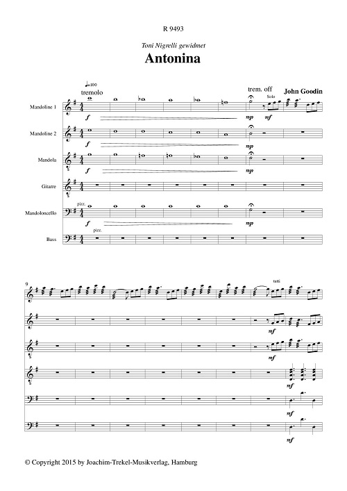 Antonina entstand für das “En Masse Orchestraö anlässlich der “Convention of the Classical Mandolin Society of America 2010ö, eine Art Kongress, der in Seattle, Washington stattfand. Es ist benannt nach und gewidmet für Antonina (“Toniö) Nigrelli, eine der Gründungsmitglieder der CMSA. Toni dirigierte mehr als 20 Jahre lang das “Long Island Mandolin and Guitar Orchestraö und war eine andere wichtige Fürsprecherin seiner Werke. Antonina was written to be performed by the En Masse orchestra at the 2010 Convention of the Classical Mandolin Society of America, held in Seattle, Washington. It is named for, and dedicated to, Antonina (“Toniö) Nigrelli, one of the founding members of the CMSA. Toni has conducted the Long Island Mandolin and Guitar Orchestra for over 20 years and has been another strong advocate for Goodin’s mandolin orchestra compositions.