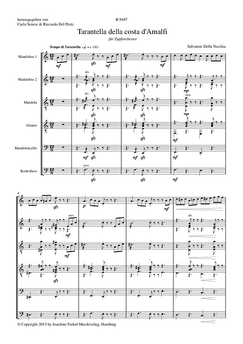 Die Musik Tarantella della Costa d'Amalfi (2012) entstand für eine Reihe von Zupfinstrumenten (Plektrum). Das Stück ist inspiriert von der phantastischen Landschaft der Amalfiküste. Komponiert in Anlehnung an die “klassischeö Tradition, besinnt sich das Stück kompetent auf die bekanntesten Volkstanz-Rhythmen Süditaliens. Diese Tarantella ist eine Ehrerbietung an das, wofür sie zweifelsohne steht: das “goldene Zeitalterö der Neapolitanischen Mandoline und der damit verbundene Erfolg der italienischen Zupforchester. Die ursprüngliche Fassung war für Zupforchester.