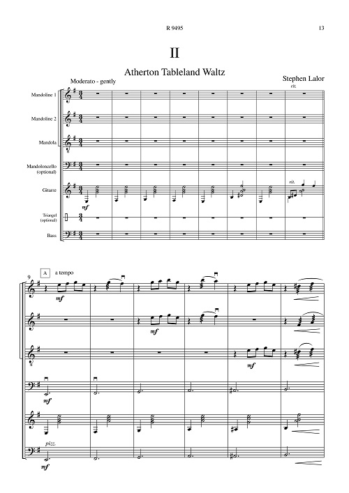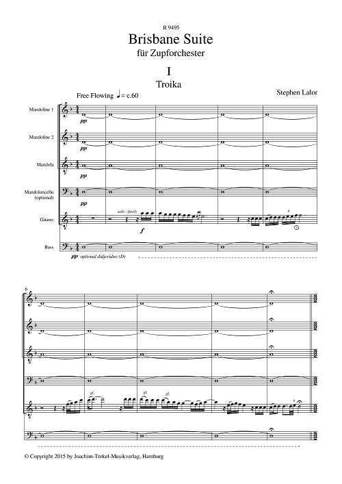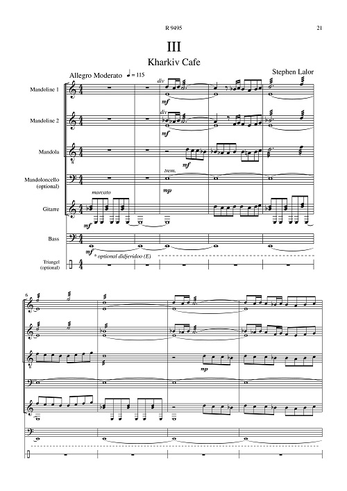 1. Satz - Troika - steht im 3er-Takt und besteht aus drei Abschnitten - daher der Titel (Troika bedeutet Trio in Russisch). Es erforscht den Klangcharakter von Zupfinstrumenten, durch überlappende Muster, einen Walzer im mittleren Abschnitt sowie einer rasenden 5/4 Coda. (mit Didjeridoo (D) da lib.) 2. Satz - Atherton Tableland Waltz - bezieht sich auf ein Plateau im Hinterland von Cairns, North Queensland, wo die Großeltern väterlicherseits des Komponisten zum „Country Dance“ trafen. Es ist ein wehmütiges, melodisches Stück. (mit Percussion (Triangel) ad lib.) 3. Satz - Kharkiv Café - verdankt seinen Namen dem Platz, an dem der Komponist an der „Initial-Idee“ für dieses Stück während einer Pause seiner Recherchen zu Lehrmethoden auf Zupfinstrumenten an der Kharkiv Konservatorium arbeitete. Kharkiv (Kharkov in Russisch) ist die zweitgrößte Stadt und ehemalige Hauptstadt der Ukraine. (mit Didjeridoo (E) ad lib)