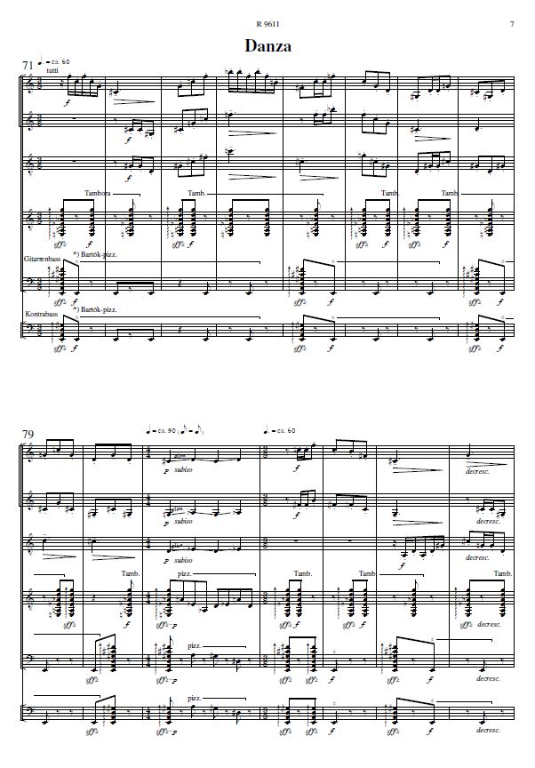 While the lyrical aspects of the instruments are naturally exploited in the «Aria», the rhythmically and metrically concise «Danza» combines them with the distinctive sounds of the plucked strings. The relationship between the two parts also extends to the thematic and gestural level. The sound spectrum is expanded by instrumental sound effects of the guitar such as rasgueado, pizzicato and tambora. The two parts are connected attacca by a cadenza of the first mandolin and guitar.